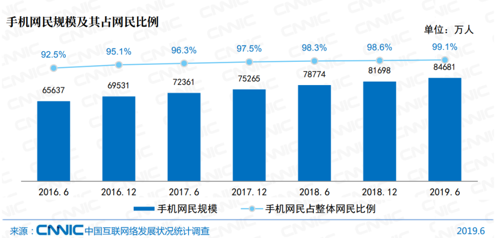 手机网民规模达8.47亿,较2018年底增长2984万,网民中使用手机上网的比例由2018年底的98.6%提升至99.1%。