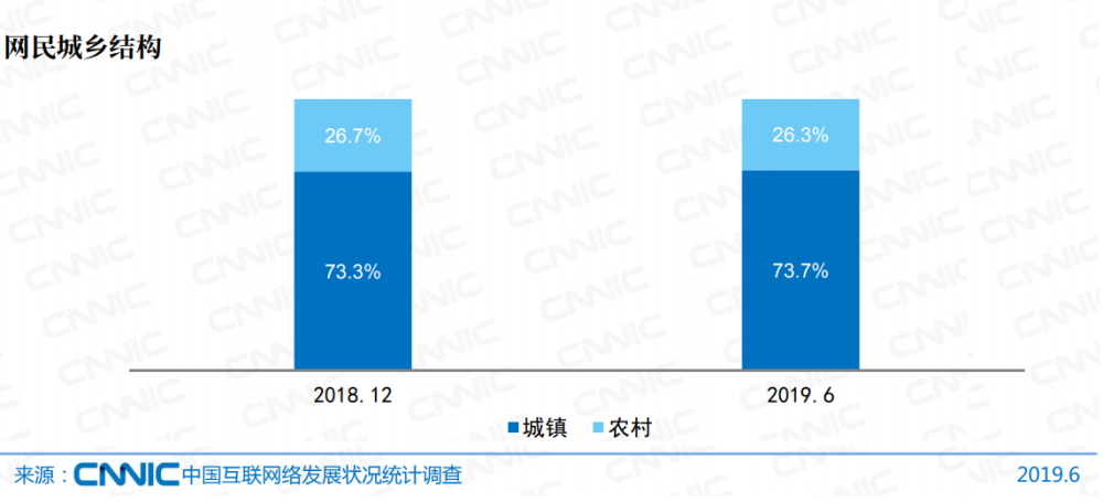 截至2019年6月,我国农村网民规模为2.25亿。占网民整体的26.3%,较2018年底增长305万;城镇网民规模为6.30亿,占网民整体的73.7%,较2018年底增长2293万。