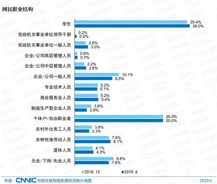 在我国网民群体中,学生最多,占比为26.0%;其次是个体户/自由职业者,占比为20.0%;企业/公司的管理人员和一般人员占比共计11.8%。