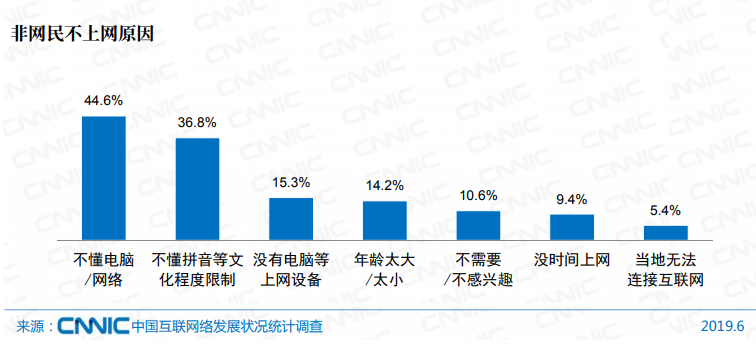 此外,截至2019年6月,我国非网民规模为5.41亿,其中城镇地区非网民占比为37.2%,农村地区非网民占比为62.8%,非网民仍以农村地区人群为主。使用技能缺乏和文化程度限制是非网民不上网的主要原因。