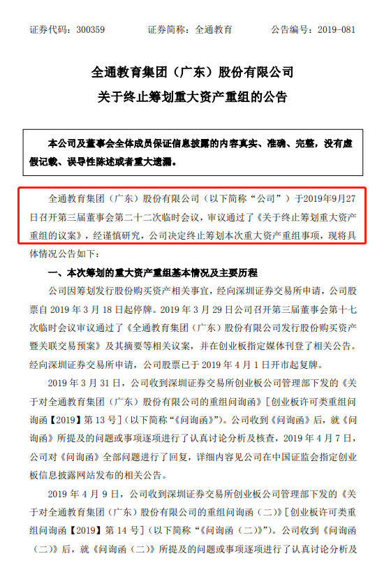 全通教育集团(广东)股份有限公司(简称“全通教育”)今日发布公告称,于2019年9月27日召开董事会临时会议,审议通过了《关于终止筹划重大资产重组的议案》,经谨慎研究,公司决定终止筹划本次重大资产重组事项。
