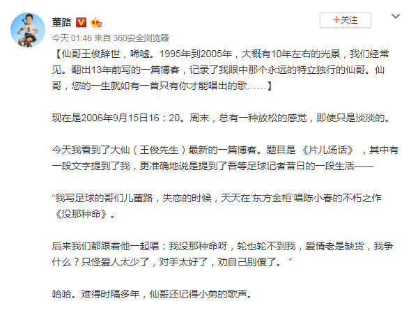 董路:仙哥王俊辞世,唏嘘。1995年到2005年,大概有10年左右的光景,我们经常见。翻出13年前写的一篇博客,记录了我眼中那个永远的特立独行的仙哥。仙哥,您的一生就如有一首只有你才能唱出的歌……