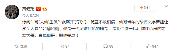 黄健翔:惊闻仙哥(大仙)王俊昨夜离开了我们,简直不敢相信!仙哥当年的球评文字曾经让多少人看的如醉如痴,他是一代足球评论的翘楚,是我们这一代足球评论员的前辈大哥。哀悼仙哥!愿他安息!