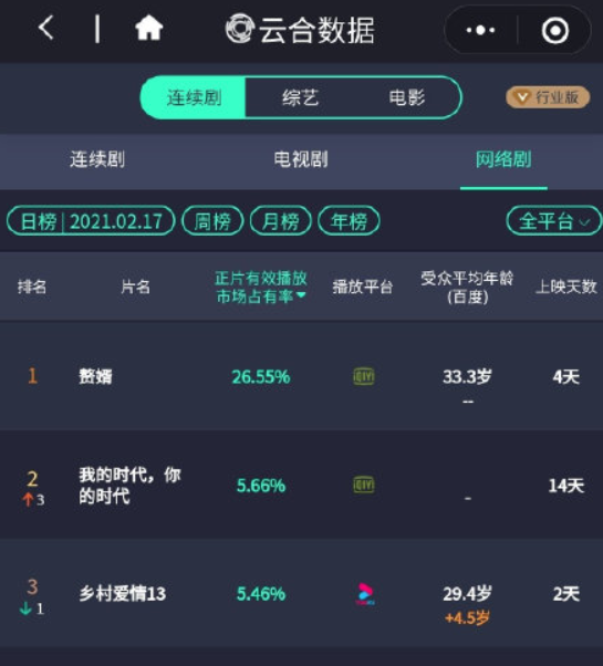 随后,《赘婿》重新定档期2月14日情人节,目前有效播放市场占有率第一。