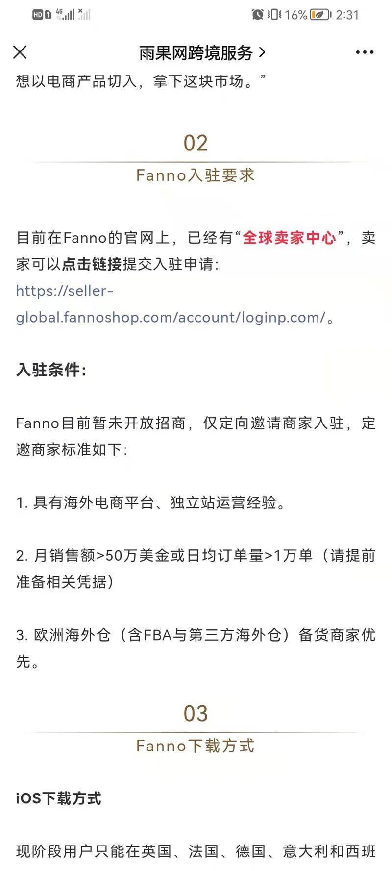 Fanno目前尚未开放招商,但已开放跨境卖家注册,对商家资质审核后方可在平台售卖。根据公开资料显示,Fanno的入驻条件为具有海外电商平台独立站运营经验、月销售额大于50万美金或日均订单量大于1万单。跨境电商从业者王小向猎云网表示,目前部分在经营别的平台的商家已经收到官方招商经理的邀请。