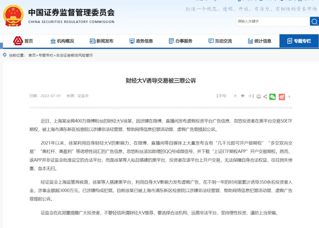 据证监会网站7月1日下午消息 近日,上海某坐拥400万微博粉丝的财经大V徐某,因涉嫌在微博、直播间发布虚假投资平台广告信息、忽悠投资者在黑平台交易50ETF期权,被上海市浦东新区检察院以涉嫌非法经营罪、帮助网络信息犯罪活动罪、虚假广告罪提起公诉。