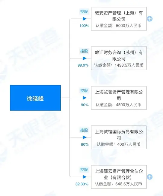 天眼查信息显示,徐晓峰共有包括上海览领资产管理有限公司在内的5家公司中持有股份。