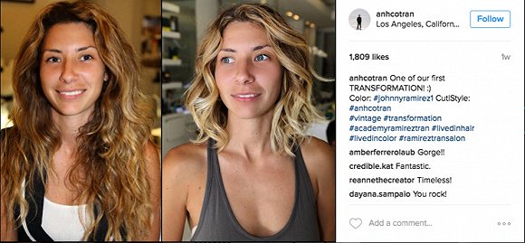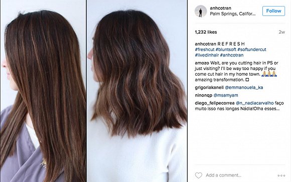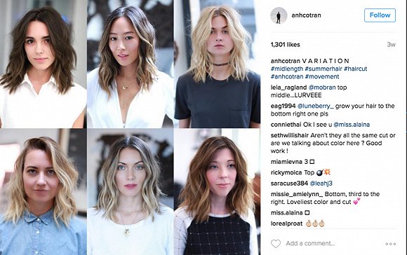 现在,Tran的Instagram粉丝有15万,这在发型界堪称出色。他意识到社交媒体是个建立品牌的好地方,所以也偶尔将自己的沙龙放上,并配合传递自己的发型哲学。Tran说他的秘诀是“活在发梢”,说白了就是你不能把头发只看做头发,而要看做生活方式的一部分,这代表你的人生价值和处事态度。