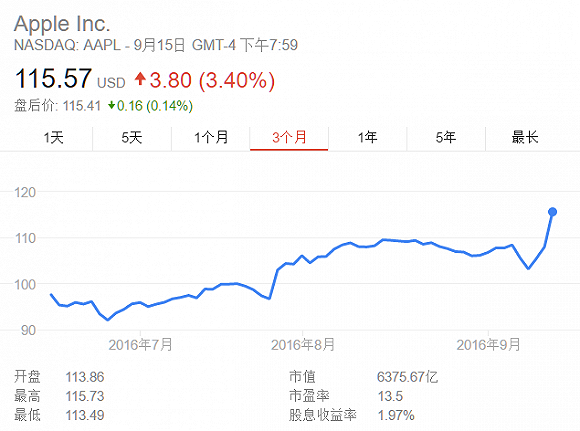 7月以来,苹果股价大涨21%,表现远超标普500指数。昨日,苹果上涨3.4%,过去四日内股价涨幅超11%,创下两年半最佳四连涨。周三,苹果宣布iPhone7已经在全球范围内售罄。