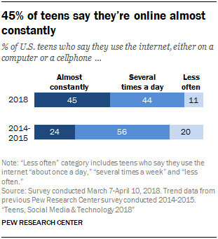 根据皮尤研究中心的最新数据显示,由于智能手机的普及,接近一半的美国青少年表示自己“几乎一致在使用互联网”。在2014-2015年的调查中,这一比例仅为24%,几乎是现在的一半。另外还有44%的青少年每天偶尔网上几次,因此可以得出有超过90%的青少年每天至少要接触多次互联网。