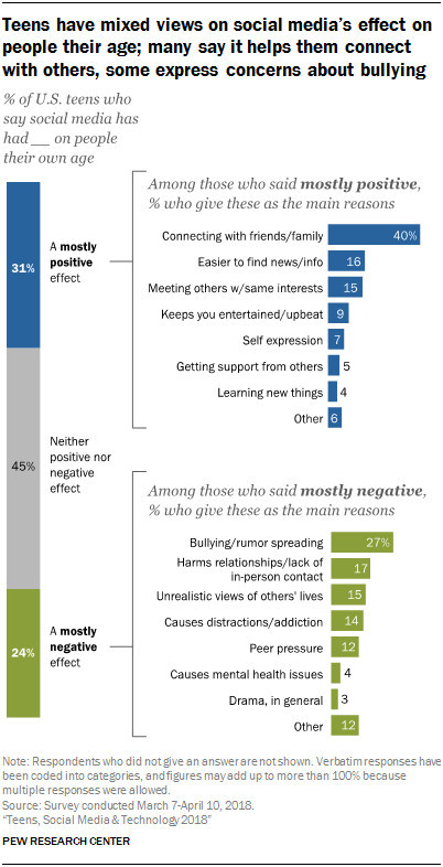 45%的青少年认为社交媒体对自己既没有产生正面影响,也没有负面影响。31%的青少年认为社交媒体对自己产生了积极影响,还有24%的人认为产生了负面影响。