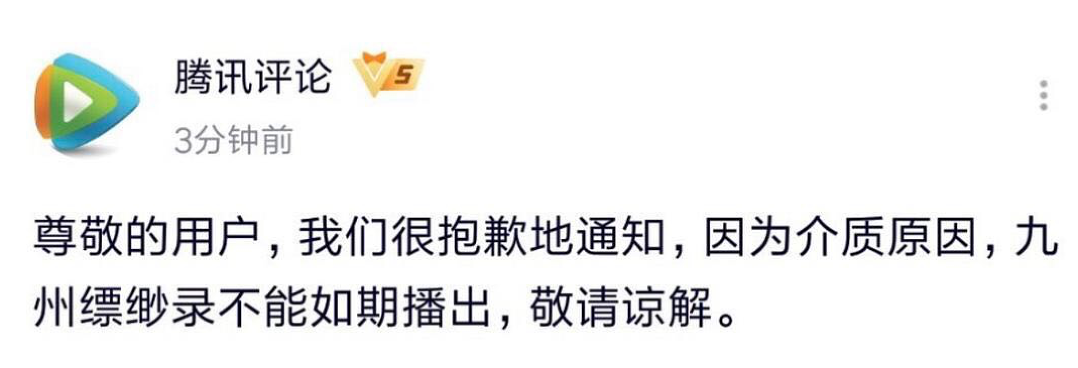 由刘昊然、宋祖儿主演的电视剧《九州缥缈录》,原定于6月3日晚22:00在浙江卫视周播剧场播出,腾讯及优酷两大网络平台联播,但在开播前半小时突然宣布暂停播出。