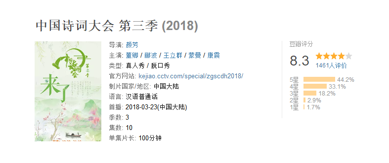 2016年年底至2017年年初,《见字如面》《中国诗词大会》第二季和《朗读者》相继刷屏,文化类节目开始受到热捧,业内专家甚至得出了“文化类节目的春天要来了”的论断,各大卫视平台和视频网站也加紧了在文化类节目领域的布局。