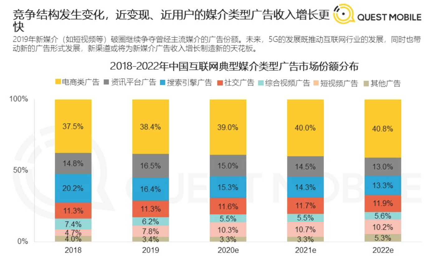 Qusetmobile 的数据显示,2018 年以来,搜索引擎广告份额持续下滑,短视频、电商广告则在上升