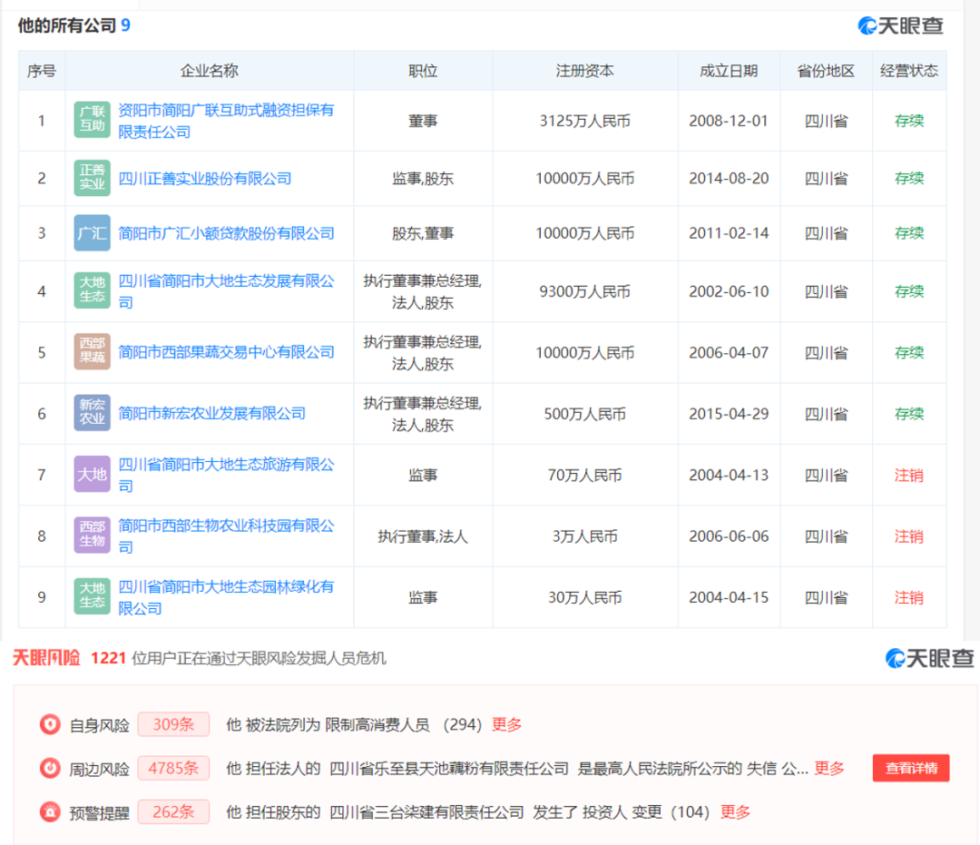 根据天眼查,CBNData星数发现周震南父亲旗下有9家公司,其中3家已经注销,且相关风险提示高达5200多条,其中“限制高消费人员”的文字赫然在列。