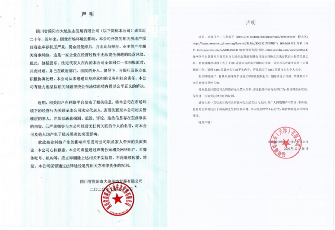 10月25日,周震南父亲的公司和周震南的经纪公司哇唧唧哇迅速发声明进行回应。前者称已在与各方积极协调处理,后者则表示相关网友散播信息时,恶意揣测旗下艺人周震南与此商业纠纷有关联,将依法取证保留进一步追究法律责任的权利。