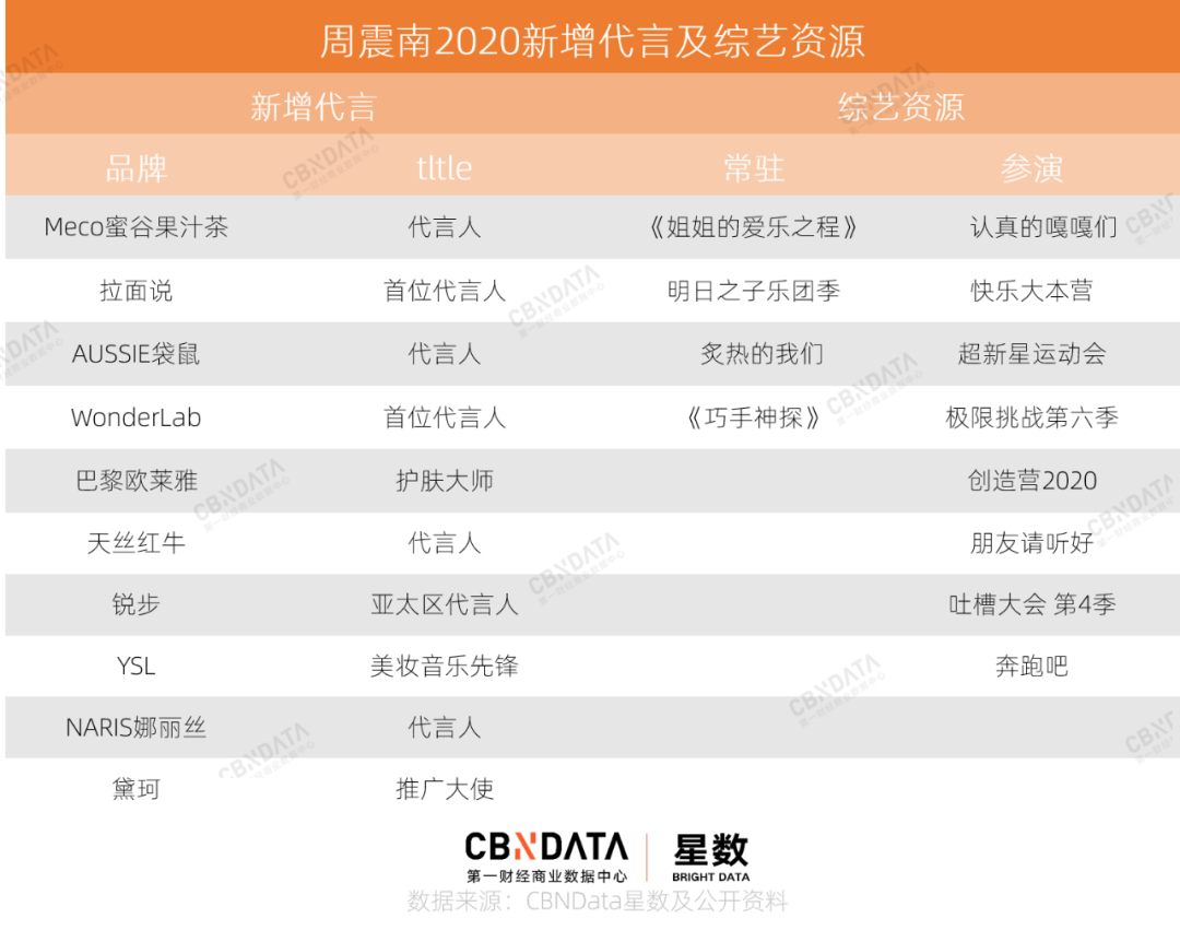 根据CBNData星数不完全统计,以R1SE成员出道后,周震南受到了19个品牌的青睐。在2020年,新增代言10个,且头衔的分量并不低,从亚太区代言人到首位代言人,周震南的品牌吸引力可以说是男偶像中的佼佼者。