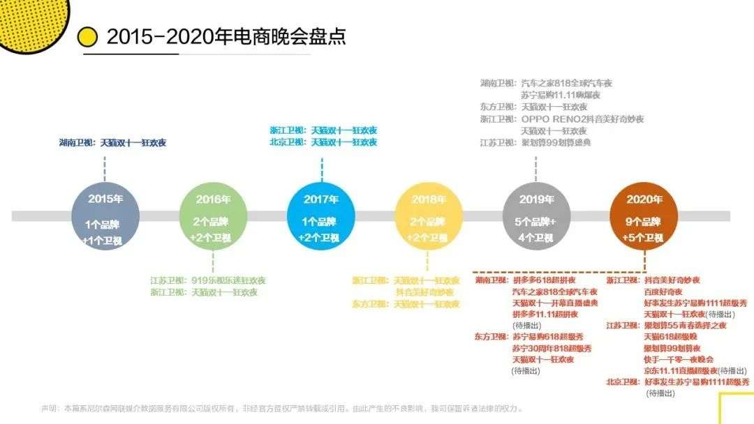 2015年春节腾讯首次尝试与春晚联姻开启微信抢红包大战,同年双十一阿里与湖南卫视首次合办“猫晚”,两巨头联手激发了互联网平台对卫视晚会的热爱。到了2020年,互联网巨头们与卫视晚会的爱情之路,已经走过了5个年头。