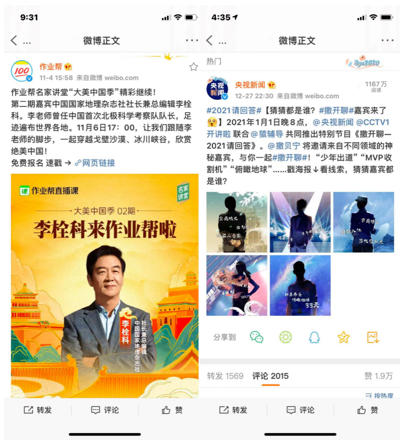 12月27日,央视新闻官宣猿辅导联合CCTV1开讲啦推出《撒开聊——2021请回答》,该节目由撒贝宁主持,包含“俯瞰地球”、“少年出道”等环节,同样是娱乐营销,除了赞助综艺《哈哈哈哈哈》,猿辅导旗下斑马AI课也独家冠名《幸福三重奏3》。