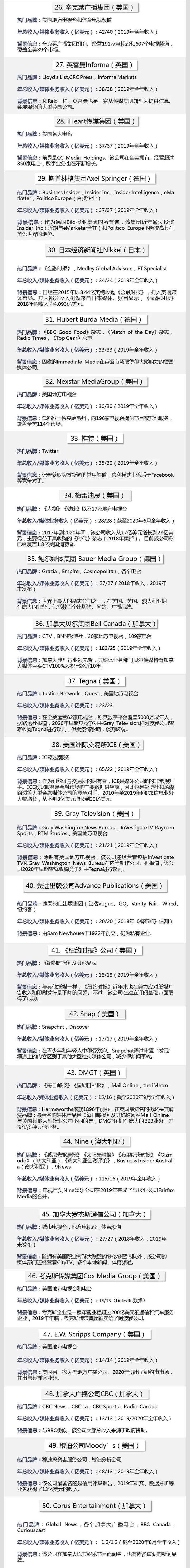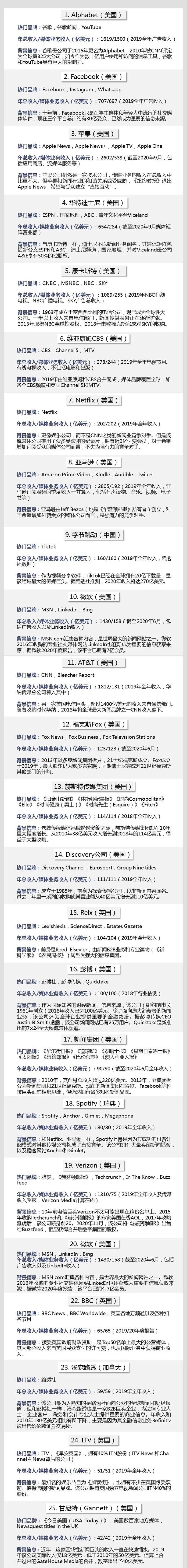 不过,在排行前30的名单中,仍然有11家传统新闻机构,除了以上提到的赫斯特、新闻集团、甘尼特之外,还包括彭博社(第16名)、BBC(第22名)、汤森路透(第23名)、英国独立电视台ITV(第24名)、辛克莱广播集团(第26名)、iHeart媒体集团(第28名)、斯普林格集团(第29名)以及拥有《金融时报》的日本经济新闻社(第30名)。