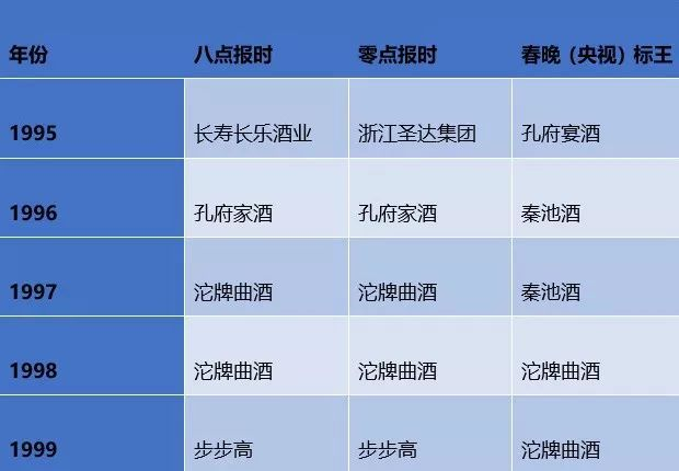 1995年到2002年,以孔府家酒、四川沱牌曲酒、哈药集团等企业凭借砸金实力,抢下一个又一个春晚标王。2003到2014年,电器盛行,12年中,美的集团先后拿下11次春晚标王的“铁王座”。