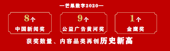 这一年, 芒果TV捧回全国抗击新冠肺炎疫情先进集体和全国脱贫攻坚奖组织创新奖两个重量级国家大奖,湖南卫视是唯一获奖的省级卫视。斩获8个中国新闻奖、9个公益广告黄河奖,1个金鹰奖,获奖数量、内容品类再创历史新高。