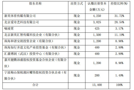 增资完成后,新爱体育注册资本将变更为 1.34 亿元,其股东情况如下: