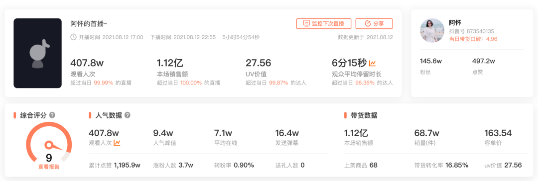 阿怀1.1亿GMV的首播成绩,不仅是当天抖音带货榜第一,也是抖音8月份截至到目前最好的带货成绩。
