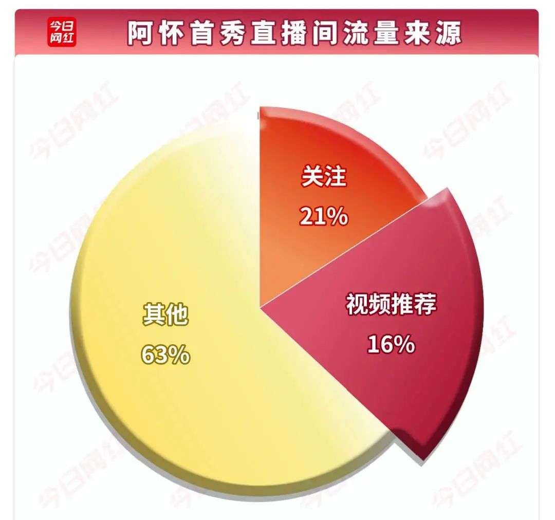 首先,阿怀首播共有407.8万观看人次,峰值达到9.5万。但据今日网红统计,其中有63%的用户是通过“直播广场、Dou+、feed投放”等方式进入直播间,21%来自粉丝关注用户,16%来自短视频导流。“直播间一般都会做正常的投放,但做到这个程度就很夸张了。”直播电商行业从业者仙英称。