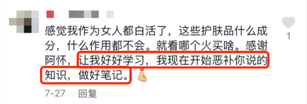 她“应粉丝要求”的说辞并不被所有人买账,有曾经是阿怀的粉丝在微博总结道:最开始刷到她的视频感觉好专业,纯交流、不卖货,就是带各位变美;后来渐渐发现有几条特别像软广,虽然她不说品牌名字,说是为粉丝着想,但大家都能在评论区找到答案,这就达到目的了。