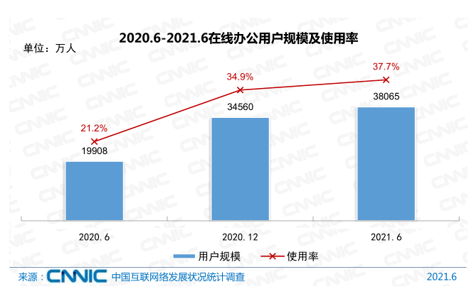 截至2021年6月,我国在线办公用户规模达3.81亿,较2020年12月增长3506万,网民使用率为37.7%。