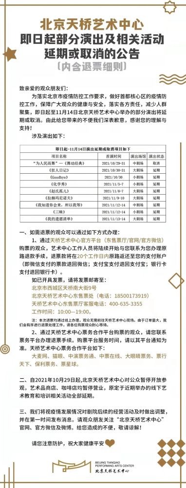 同时,按照北京市疫情防控工作有关要求部署,为切实保障广大观众的健康与安全,减少聚集,目前,各大院团和演出场所也陆续发布了取消或暂停近期演出及活动的公告。
