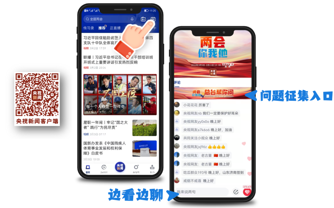 同时,总台在两会报道上不断创新融媒体传播,融媒体节目《两会你我他》两会期间正式和观众见面,于3月5日至3月11日每天13:00在央视新闻频道、央视新闻客户端、央广中国之声、国广环球资讯同步直播,一经推出即迅速出圈,实现电视端和移动新媒体的深度融合。节目电视端收视份额3.46%,新媒体端则推出特别节目《两会你我他,总台帮你问》征集活动,鼓励网友在直播情境中边看边聊,表达关切,说出想法,总台帮你找代表委员回答问题。仅3月5日一天,就有数万网友在央视新闻客户端观看并参与了直播互动,留下了自己的观点和建议。截至3月5日,“总台帮你问”也收到了近千位网友的提问,已经有6位网友的问题被采纳,登上央视新闻频道,并获特邀专家进行解答。