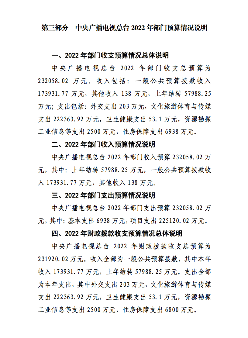 中央广播电视总台 2022 年部门收入预算 232058.02 万 元,其中:上年结转 57988.25 万元,一般公共预算拨款收 入 173931.77 万元,其他收入 138 万元。