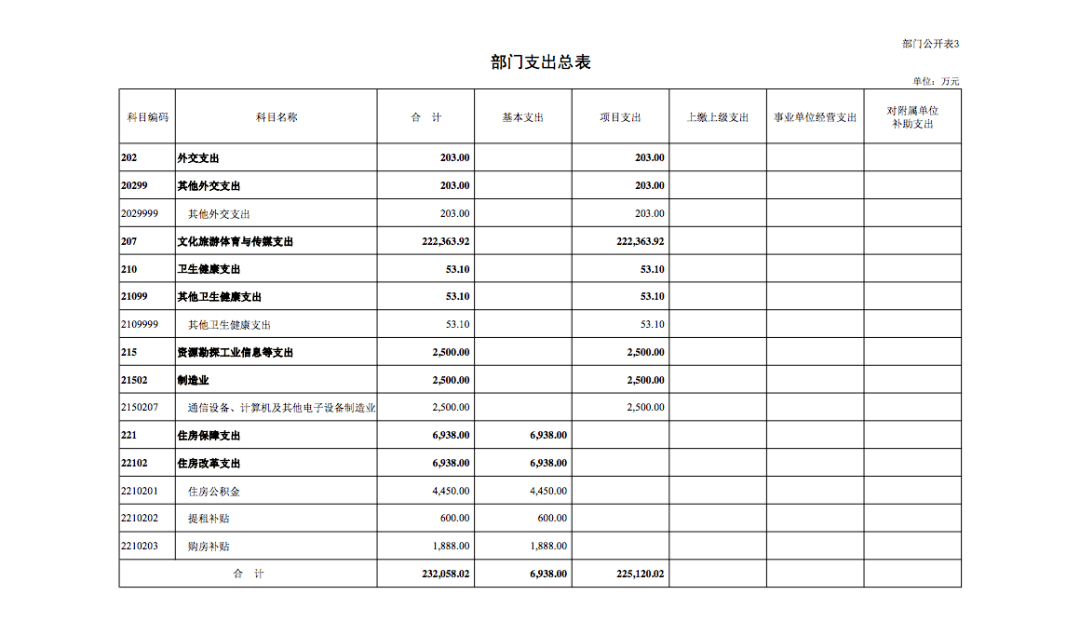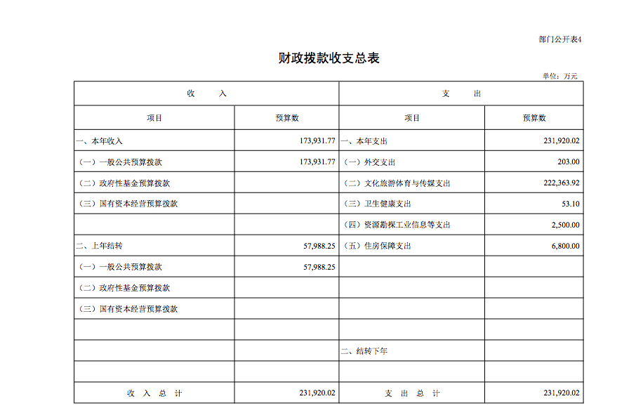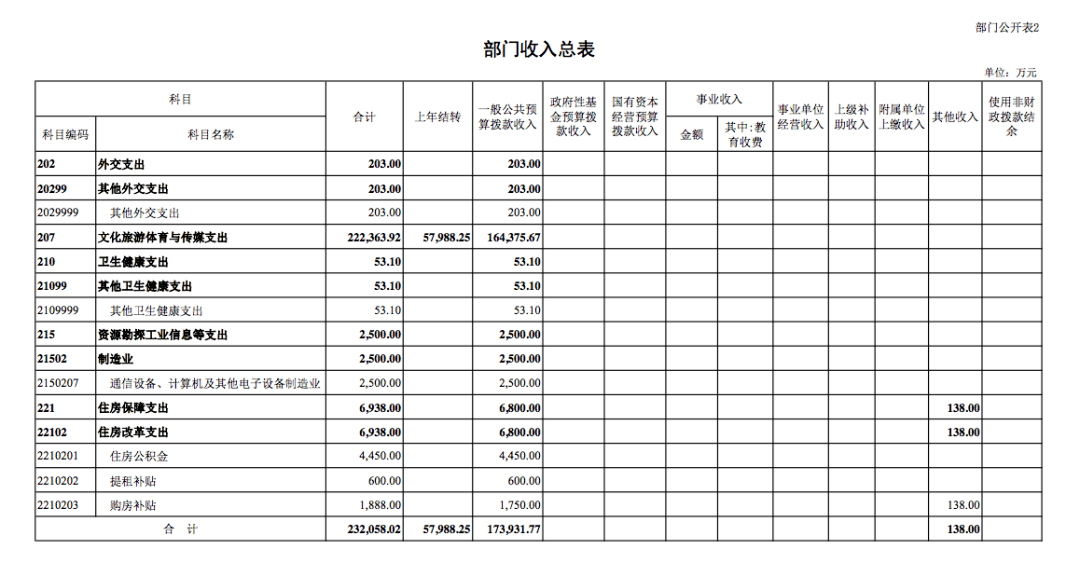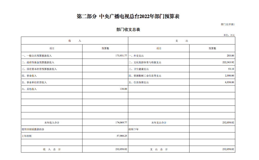中央广播电视总台 2022 年部门收支总预算为232058.02 万元。收入包括:一般公共预算拨款收入173931.77 万元,其他收入 138 万元,上年结转 57988.25万元;支出包括:外交支出 203 万元,文化旅游体育与传媒 支出 222363.92 万元,卫生健康支出 53.1 万元,资源勘探 工业信息等支出 2500 万元,住房保障支出 6938 万元。