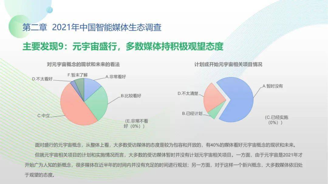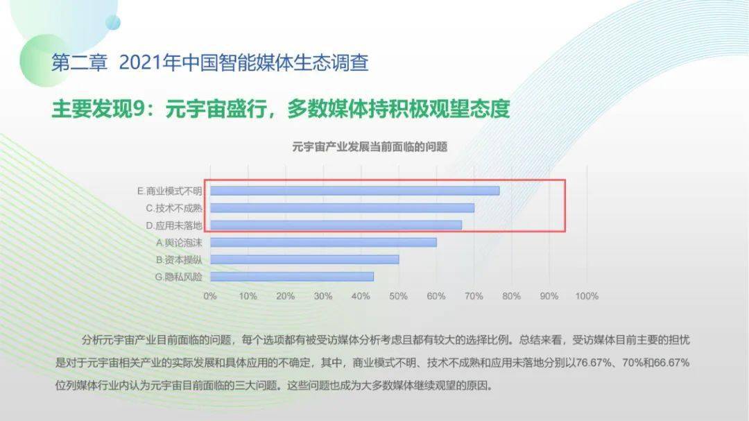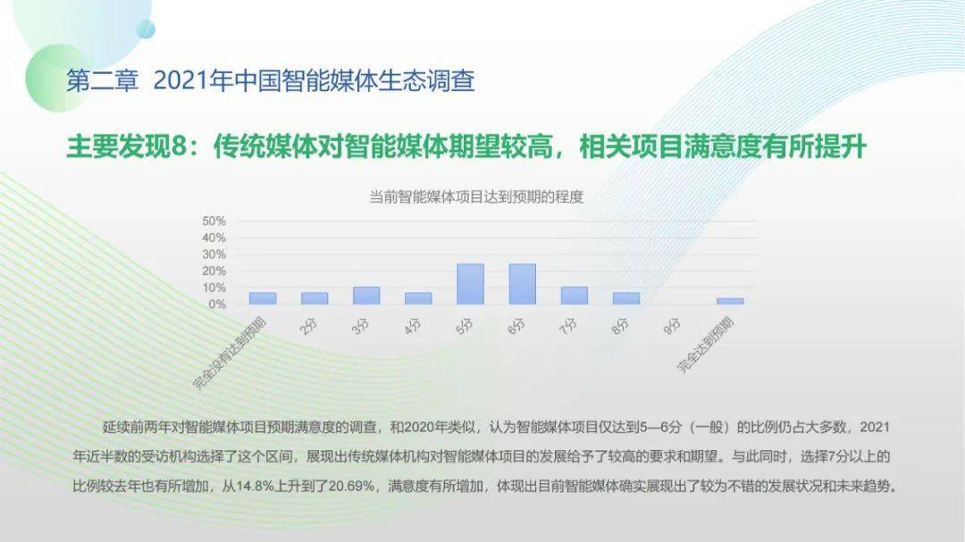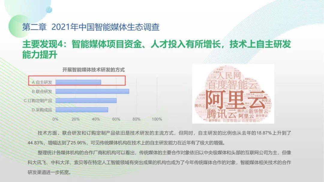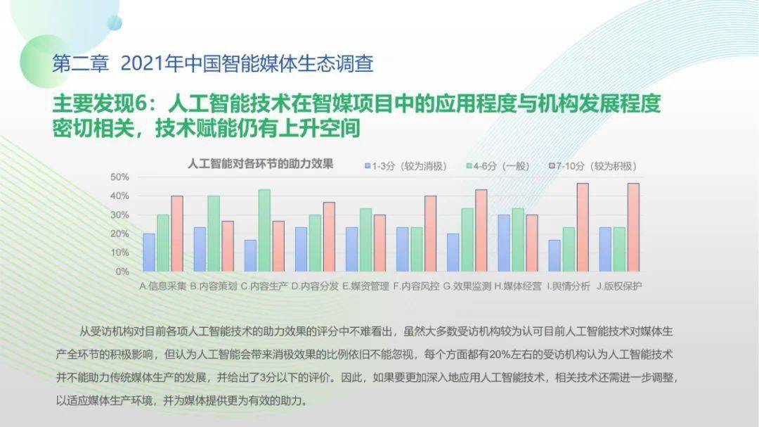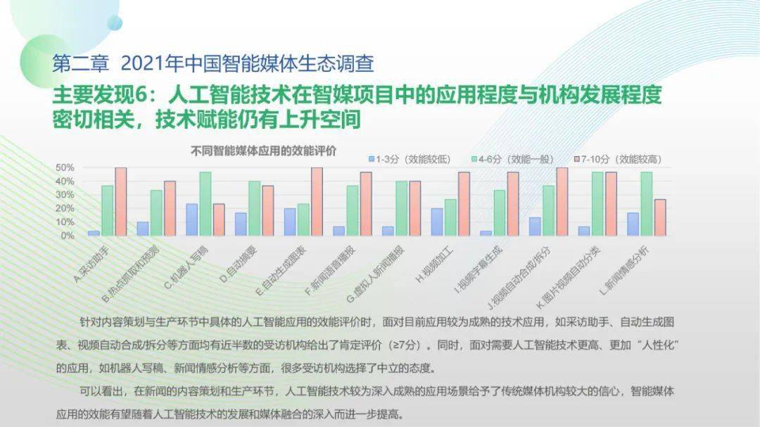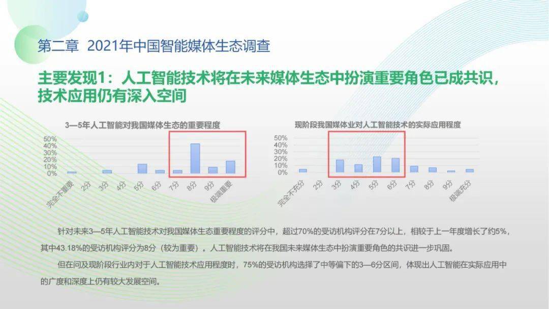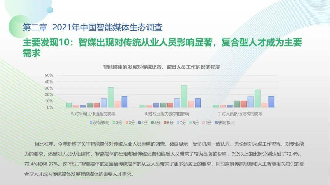 看点5:调查显示,2021年间传统媒体智媒项目自研能力得以提高,媒体同人工智能技术厂商、互联网企业的生态合作稳步展开;智能媒体机构对技术型、复合型人才的需求显著提升,产学研用协同创新在政策推动下持续推进;人工智能与媒体深度融合态势愈加显著,媒体从业人员对智能媒体发展普遍抱有较高期待,远程协作需求爆发与元宇宙概念盛行更激发了公众智能媒体应用的关注、兴趣与使用。