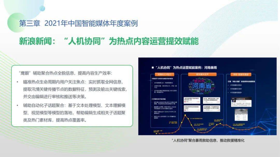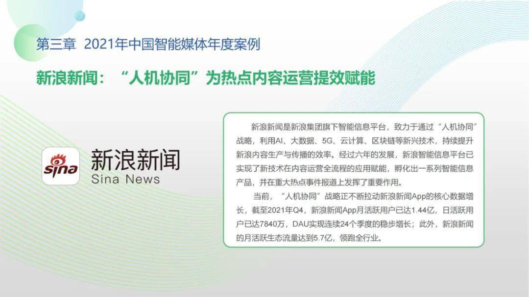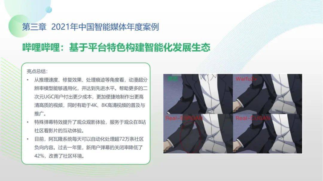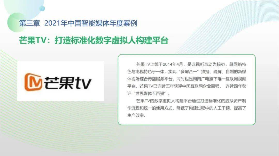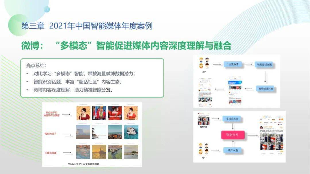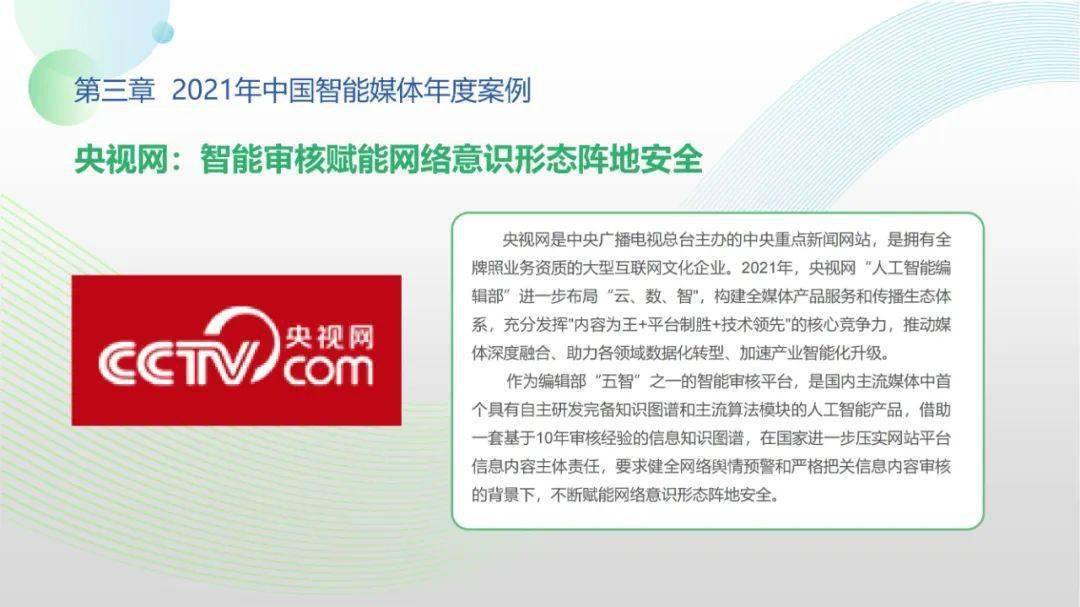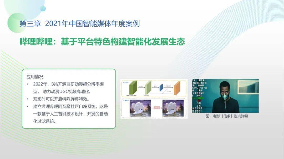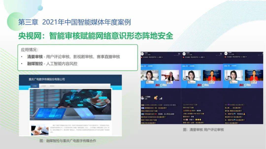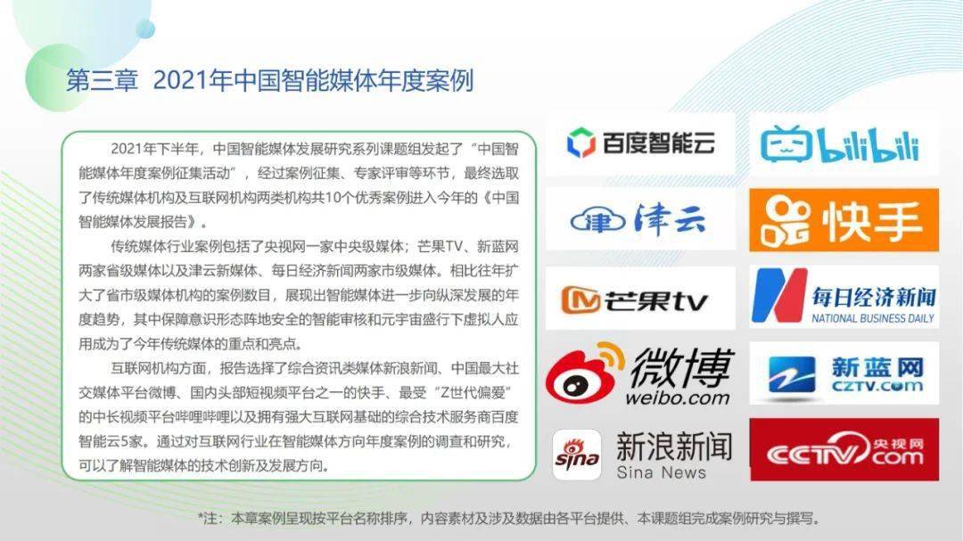 看点6:“2021-2022中国智能媒体十大年度案例”按机构名称拼音排序分别为百度智能云、哔哩哔哩、津云新媒体、快手、芒果TV、每日经济新闻、微博、新蓝网、新浪新闻、央视网。年度案例合作单位全面覆盖中国新型主流媒体与领先商业平台,央视网清晏审核与融媒智控系统、百度智能云智能媒体解决方案、新浪新闻“人机协同”战略及其应用、微博“多模态”智能应用、芒果TV数字虚拟人构建平台、哔哩哔哩“阿瓦隆社区自净系统”等前沿案例值得学界业界高度关注。