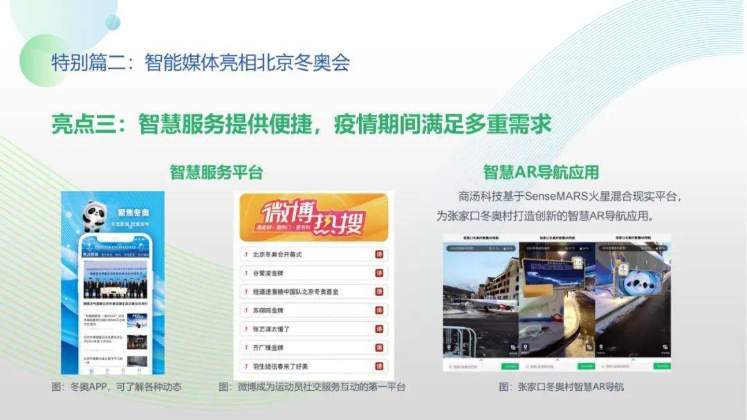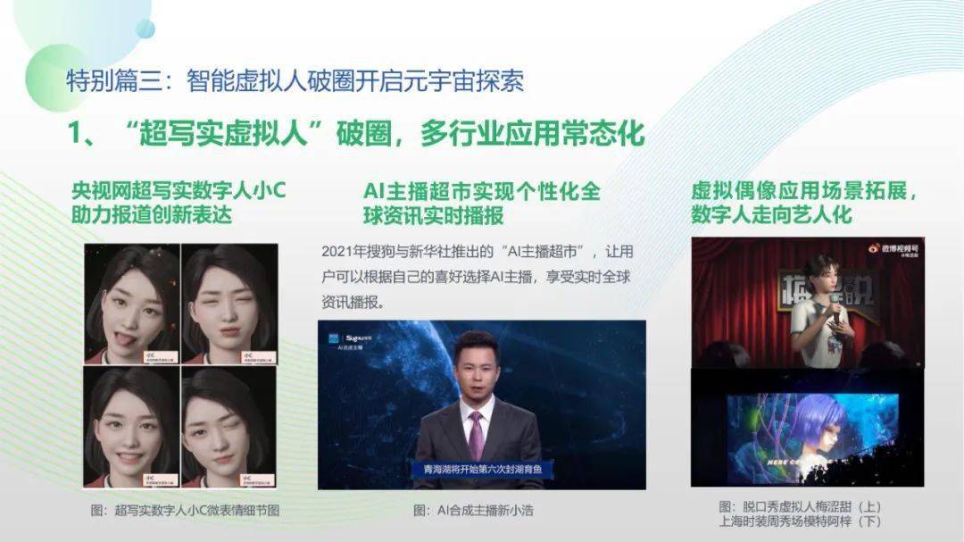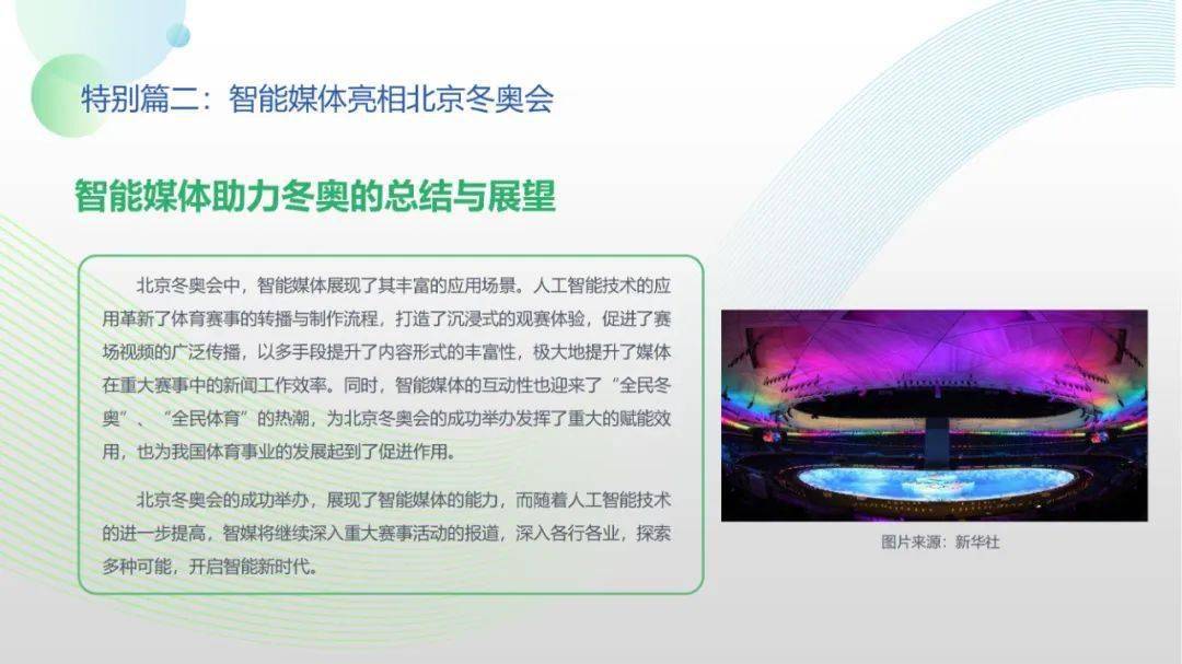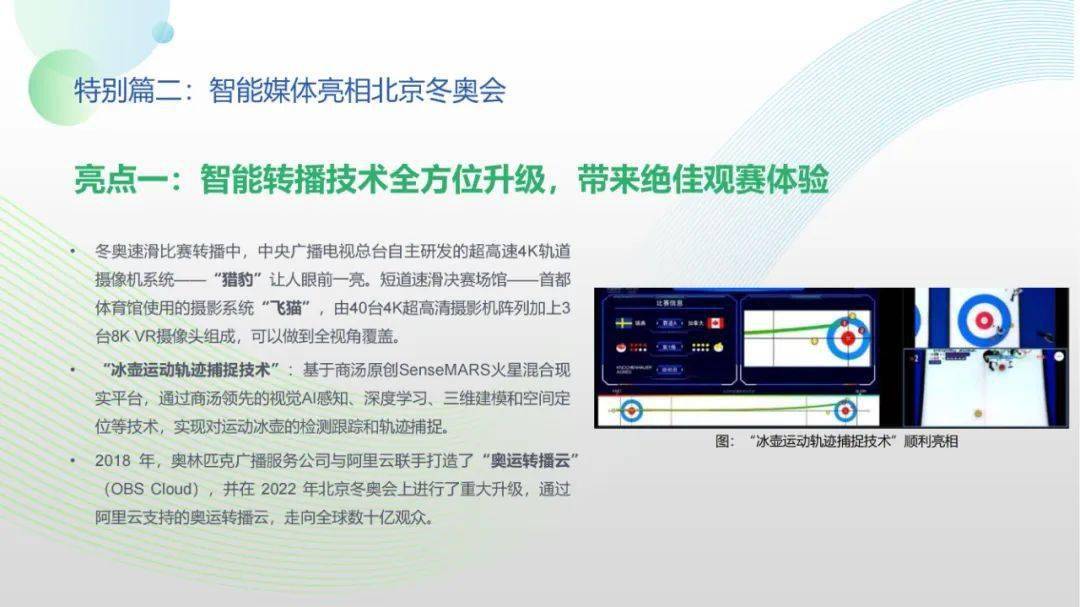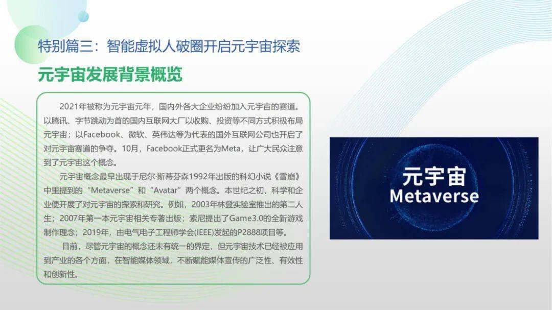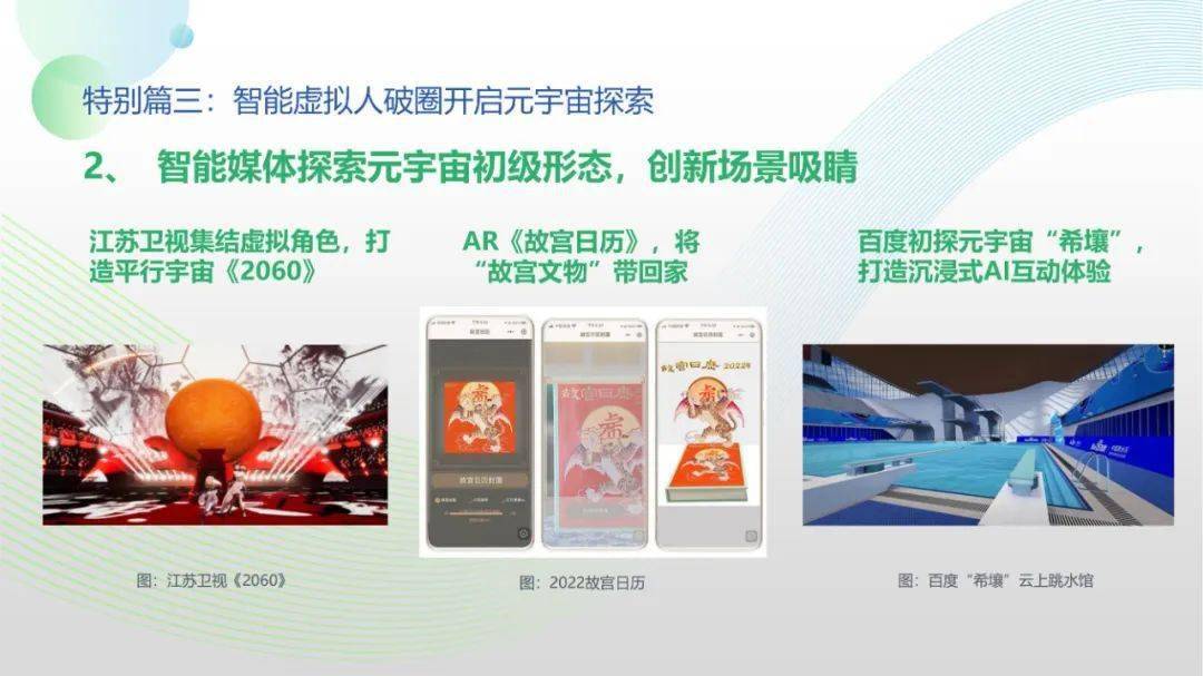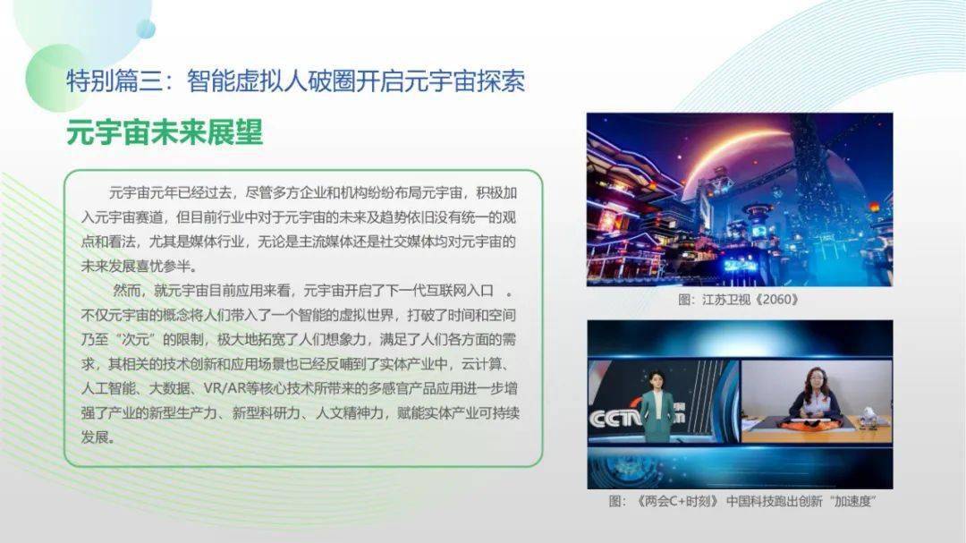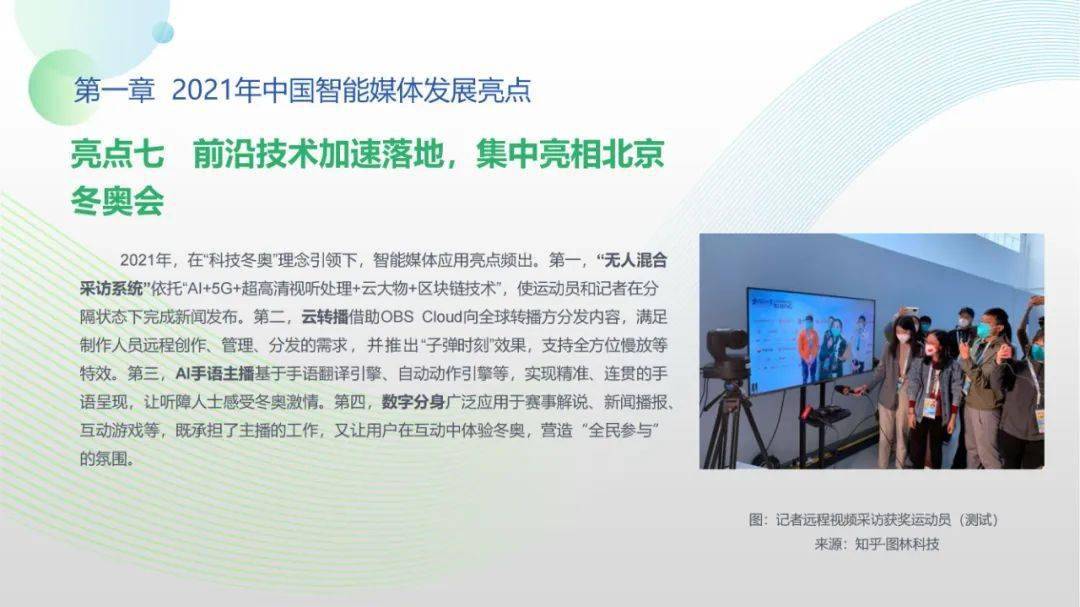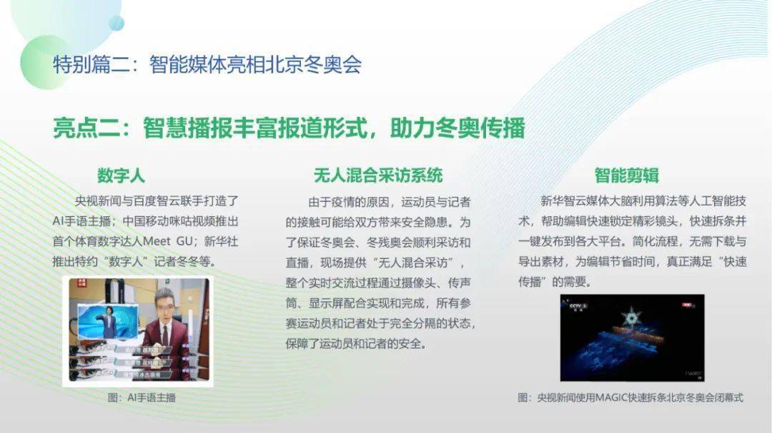 看点8:报告特别篇集中展现了智能媒体前沿应用在智慧党建、科技冬奥与元宇宙探秘三大创新场景中的魅力:党建场景下,视频智能修复、红色云展厅、党史机器人等助力党史教育,数智党建一体化平台持续赋能基层党建;冬奥场景下,混合无人采访系统、智能手语主播、数字分身、云转播、热点智能分发等创新赛事报道,打造绝佳全媒体观赛体验;元宇宙场景下,AI虚拟人行业应用频繁破圈,资本高调涌入,产业加速布局,媒体高频报道,“科幻”般吸睛场景背后显露出各界对元宇宙前景的热切期待。