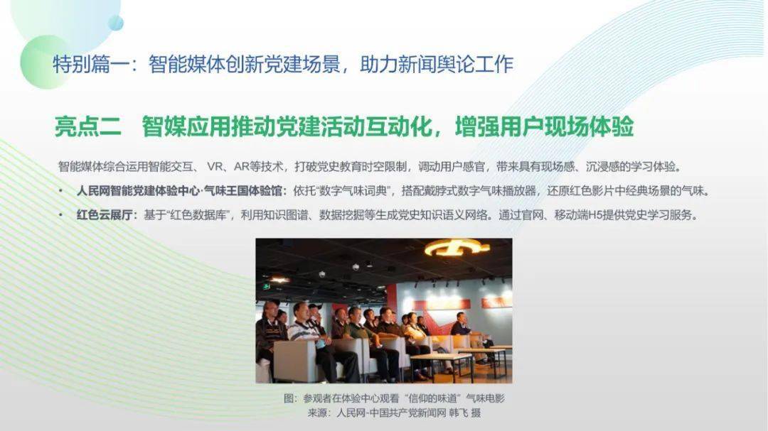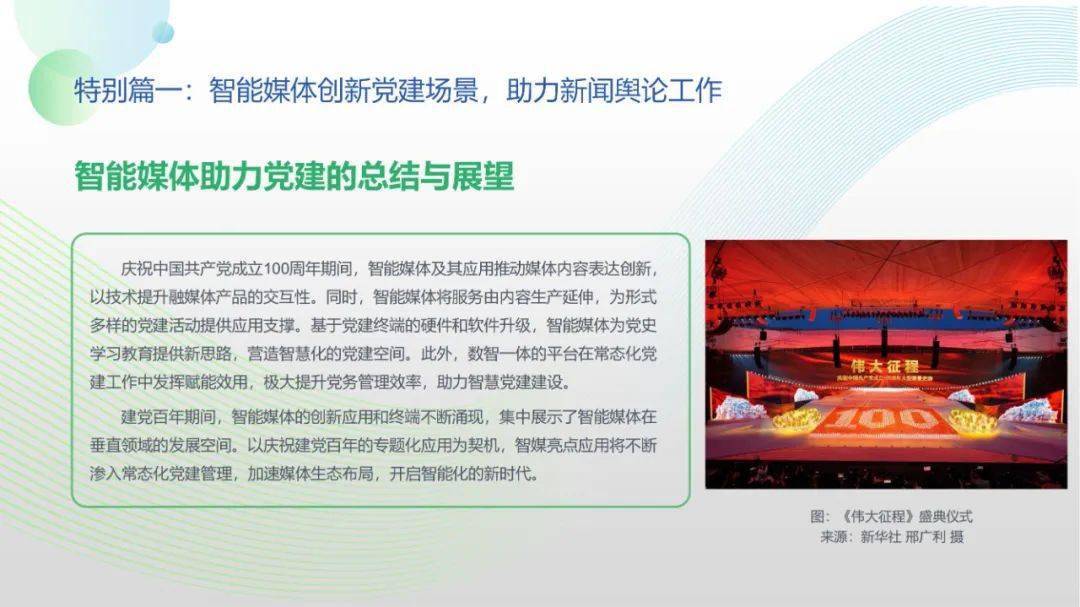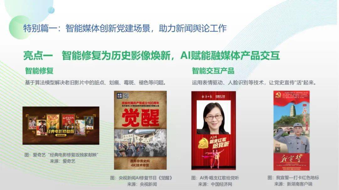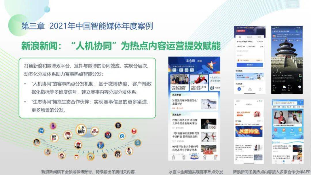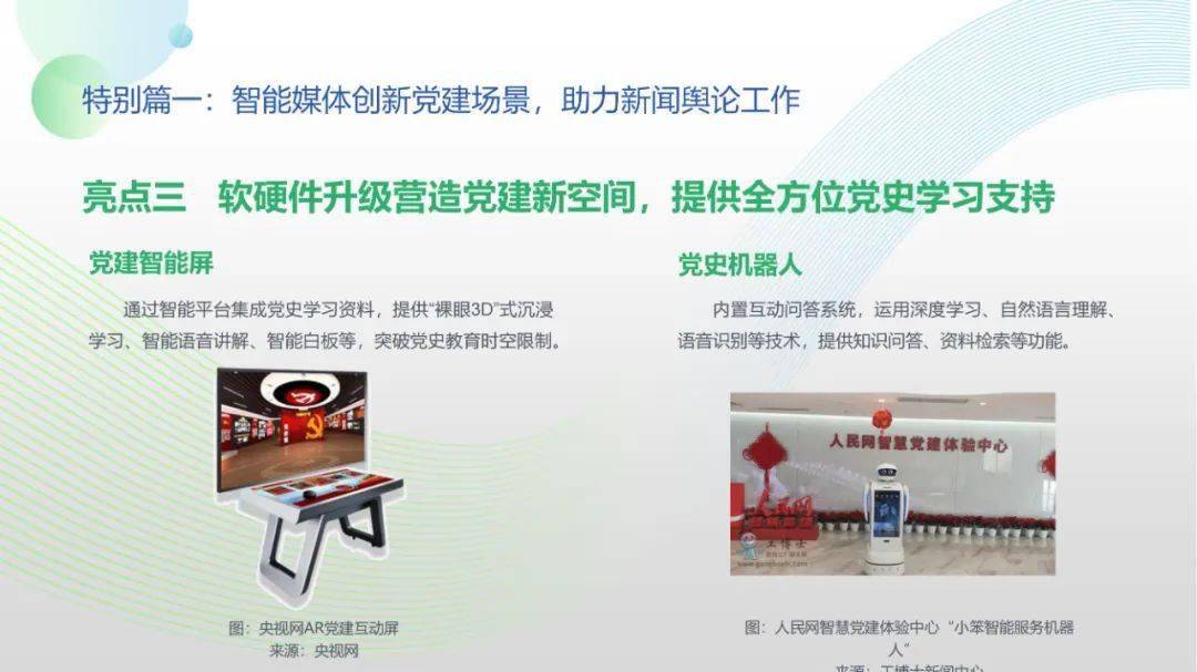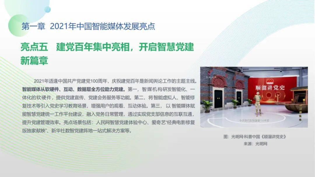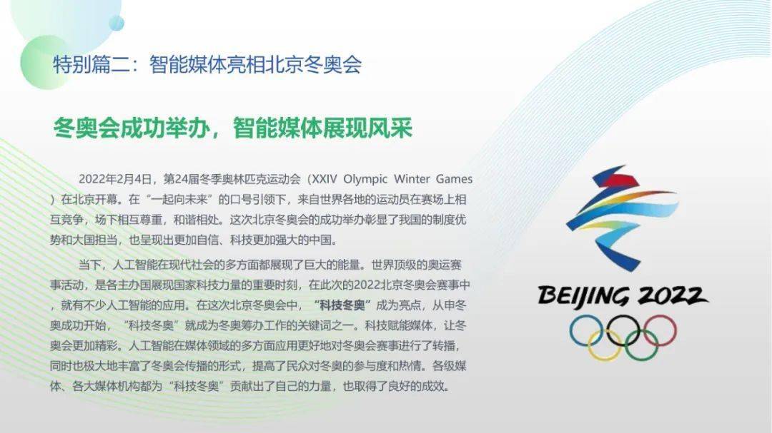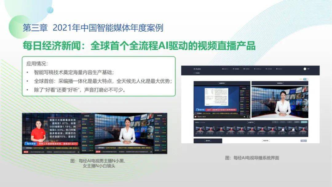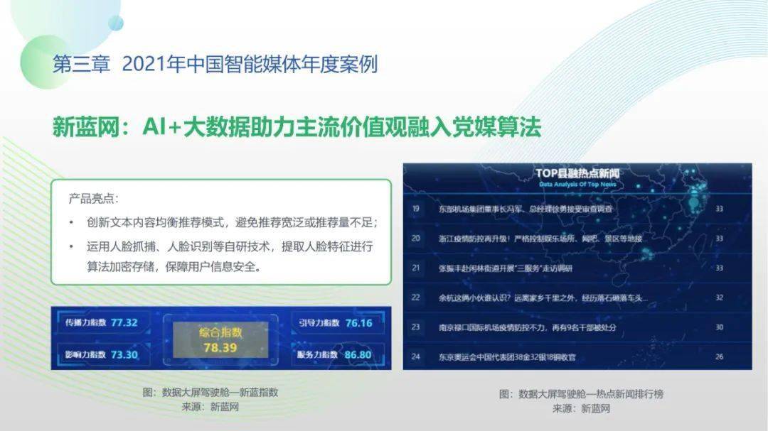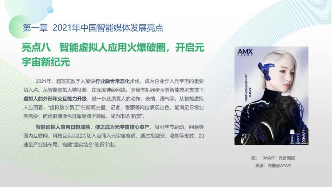 看点8:报告特别篇集中展现了智能媒体前沿应用在智慧党建、科技冬奥与元宇宙探秘三大创新场景中的魅力:党建场景下,视频智能修复、红色云展厅、党史机器人等助力党史教育,数智党建一体化平台持续赋能基层党建;冬奥场景下,混合无人采访系统、智能手语主播、数字分身、云转播、热点智能分发等创新赛事报道,打造绝佳全媒体观赛体验;元宇宙场景下,AI虚拟人行业应用频繁破圈,资本高调涌入,产业加速布局,媒体高频报道,“科幻”般吸睛场景背后显露出各界对元宇宙前景的热切期待。