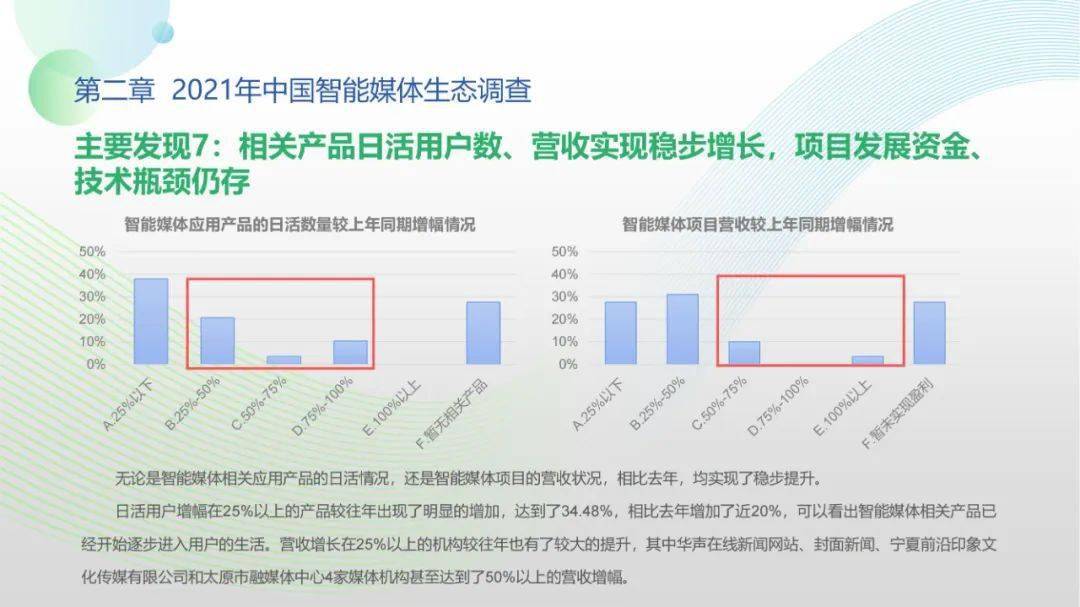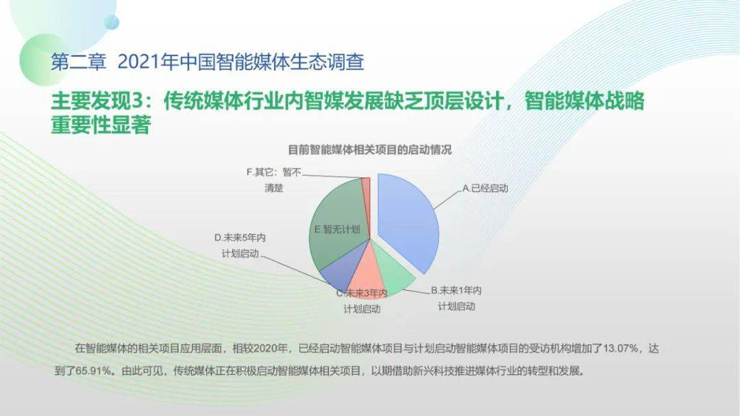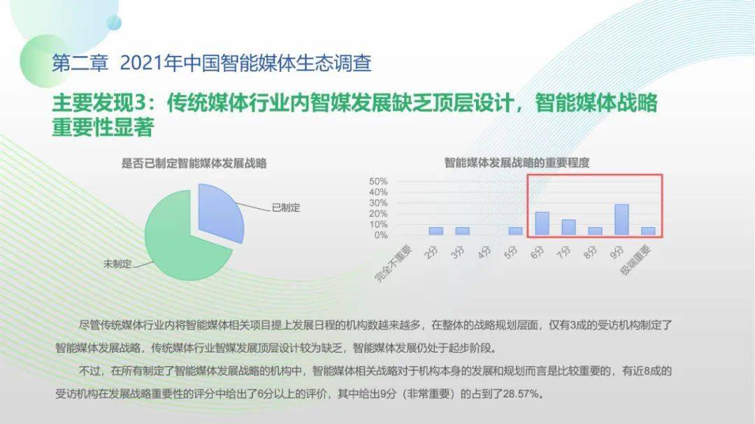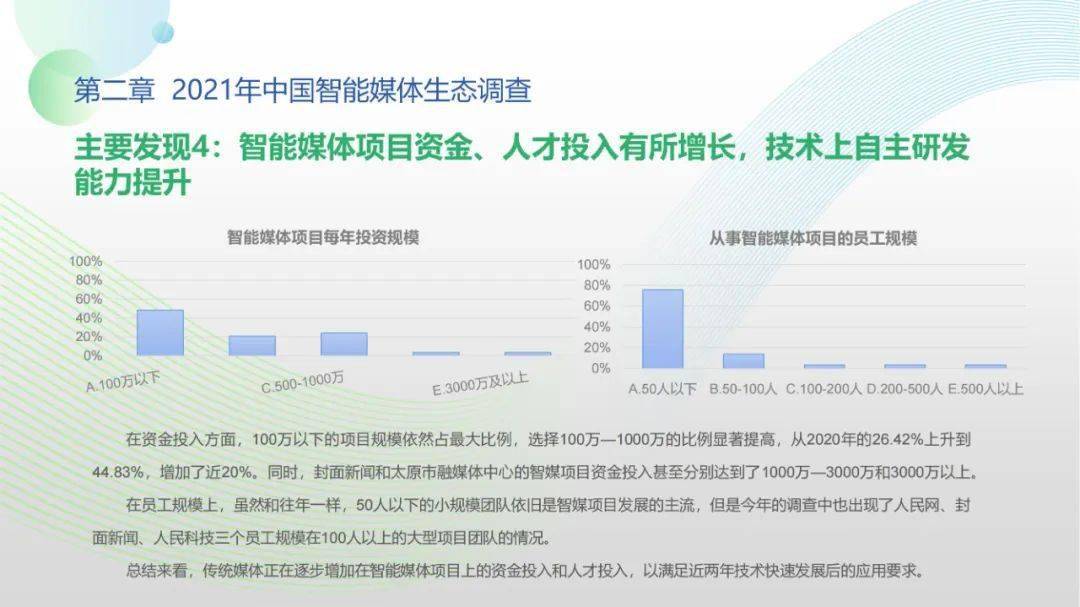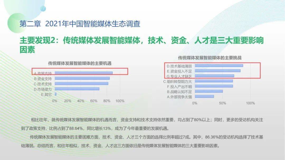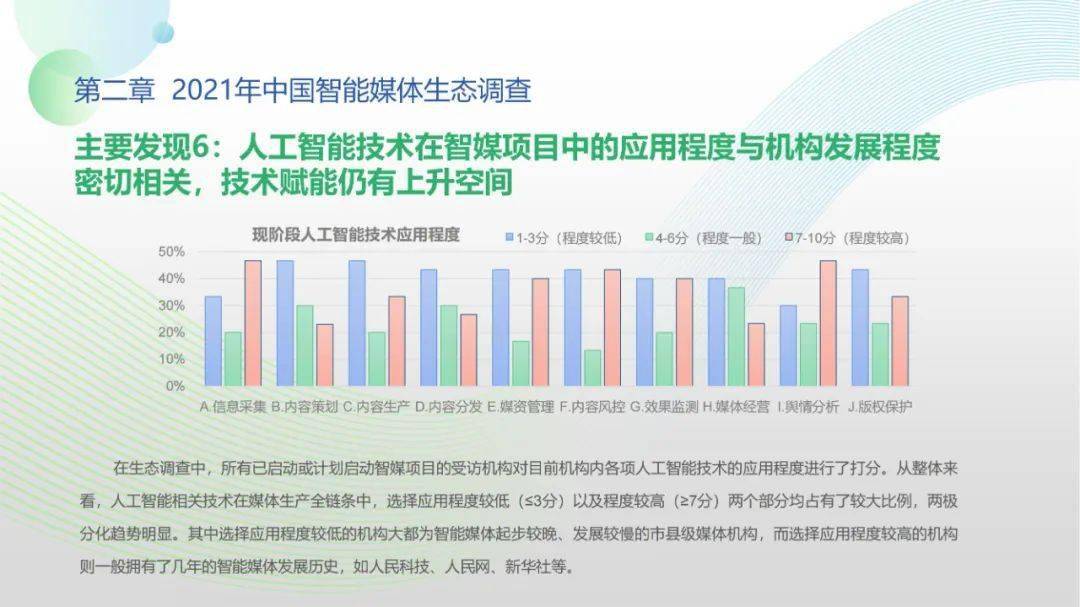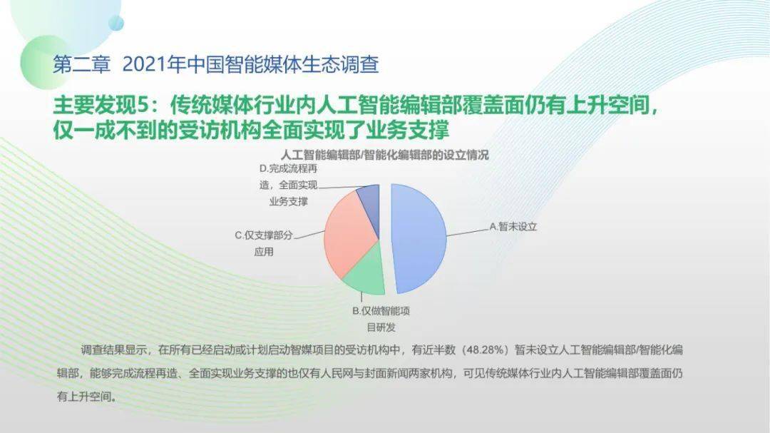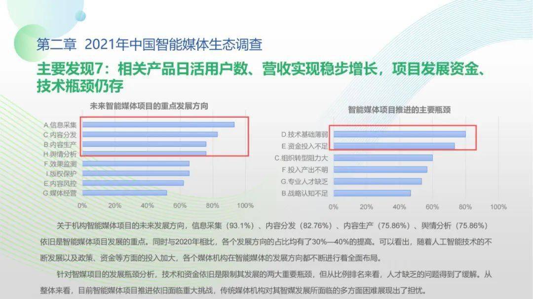 看点4:“中国智能媒体年度生态调查(2021-2022)”调查对象包括44家各级通讯社、报纸、广播、新媒体等各类媒体机构。调查显示,国家政策为智能媒体发展提供了关键利好,受访机构2021年间相关智能媒体项目得以稳步推进。北京冬奥会、建党百年等重大事件加速智能媒体项目落地,资金、人才投入持续扩大。但整体上看,我国智能媒体发展仍处于起步阶段,多数媒体机构尚未制定智能媒体发展战略规划,资金、技术、人才瓶颈待突破,智媒应用对传媒机构全流程全链条支撑仍有较大成长空间。