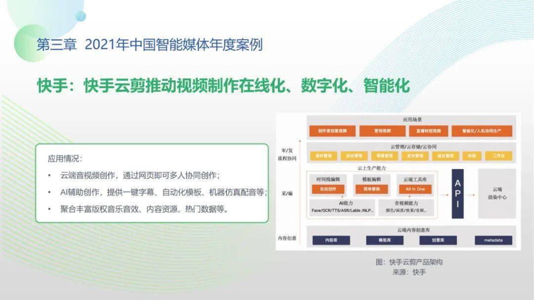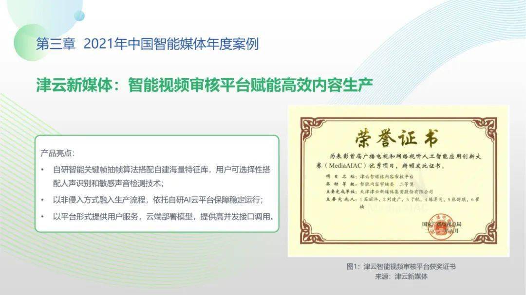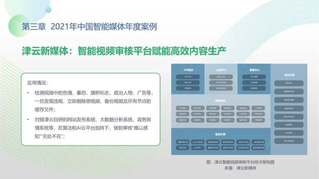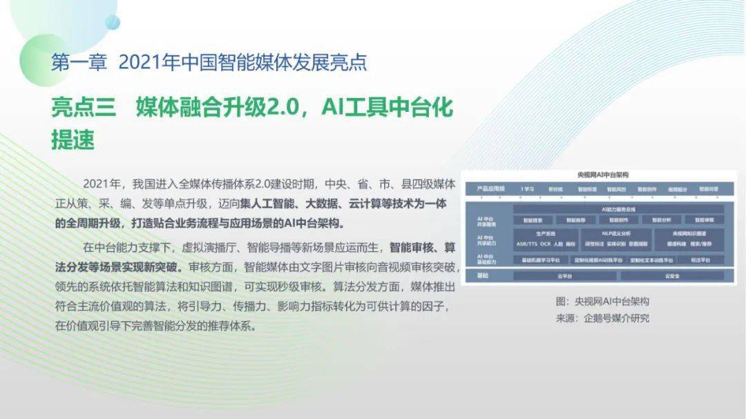 看点2:技术层面,2021年我国已步入全媒体传播体系建设2.0时期,中央、省、市、县四级媒体迈向集人工智能、大数据、云计算等技术为一体的全周期升级,重点打造贴合业务流程与应用场景的AI中台架构。基于中台能力,智能审核、算法分发场景实现新突破。审核方面,音视频审核精度升级,依托智能算法和知识图谱,可实现秒级审核。分发方面,符合主流价值观的全新算法不断完善,引导力、传播力、影响力等指标被纳入智能分发的算法体系。
