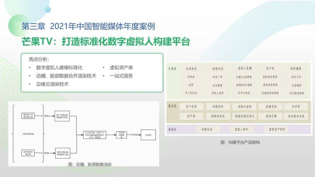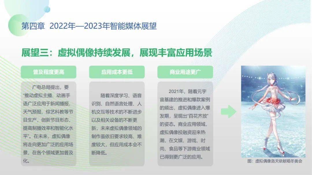 看点3:应用层面,后疫情时代,智能媒体被广泛用于应急传播、灾情报道、常态化防疫管理、网络理政等新场景,推动“智媒+社会治理”模式创新;党建机器人、云上音乐厅、智能拍摄机器人等亮点应用频出,智能媒体持续赋能党建、文旅、会展等垂直行业应用,推动“智媒+千行万业”服务创新;智能媒体前沿技术集中亮相北京冬奥会,云转播、AI手语主播、数字分身等应用彰显智媒无限潜能;智能虚拟人应用创新火爆破圈,商业化进程加速,吸引众多领先企业加速元宇宙全产业链布局。