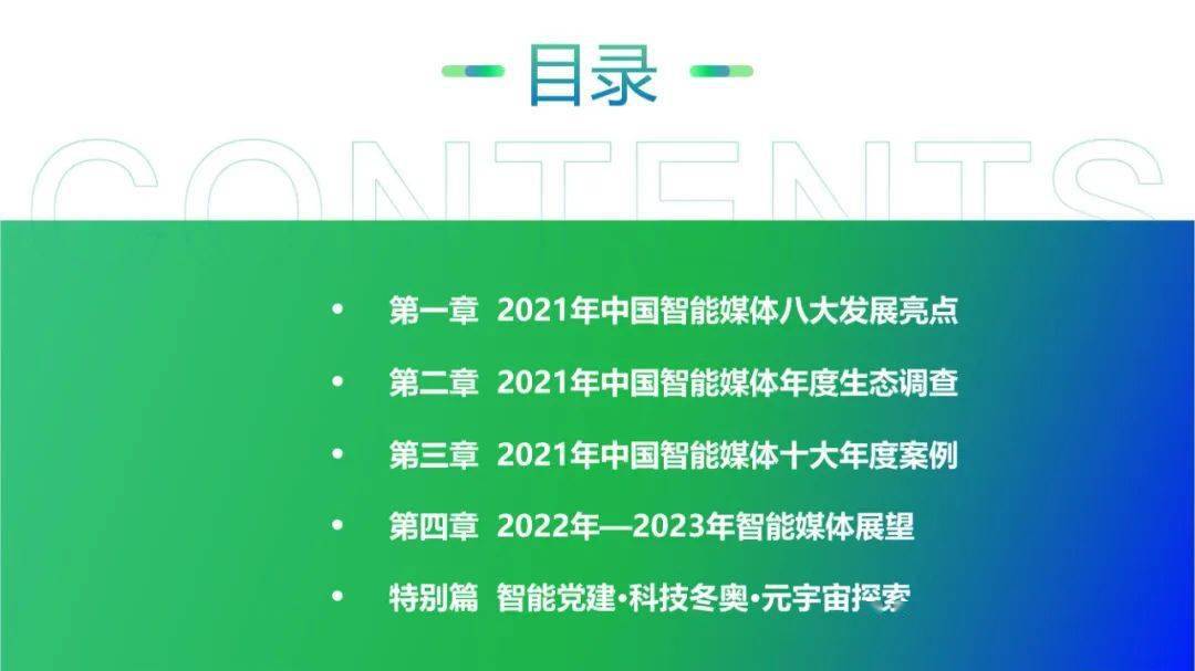 《中国智能媒体发展报告(2021-2022)》包括五大部分:第一部分全面盘点了2021年间中国智能媒体发展八大亮点;第二部分基于针对44家各级各类媒体机构的调查反馈,描摹我国智能媒体应用生态版图及其迭代态势;第三部分深度呈现中国智能媒体十大年度案例(按机构名称拼音排序:百度智能云、哔哩哔哩、津云新媒体、快手、芒果TV、每日经济新闻、微博、新蓝网、新浪新闻、央视网),深度解析行业最佳实践;第四部分立足智能媒体落地趋势及热点,研判2022-2023年智能媒体发展短期趋势。第五部分“特别篇”辑录了2021年三大智能媒体发展热点议题,即智慧党建、科技冬奥与元宇宙探秘,立体展现智能媒体在垂直领域的强大势能。