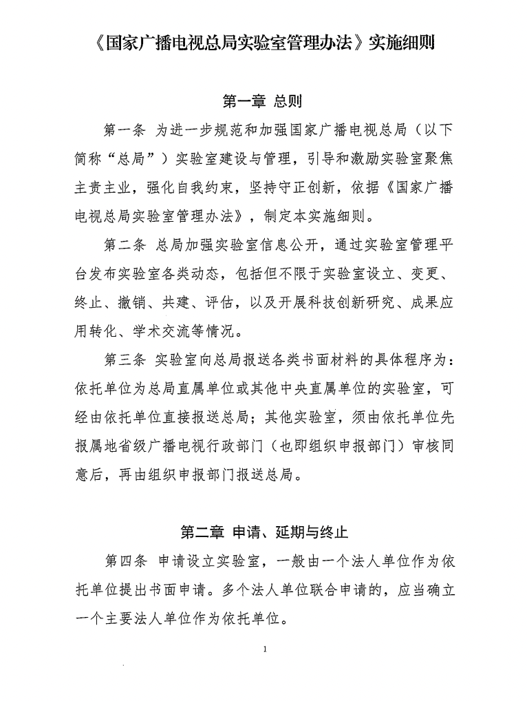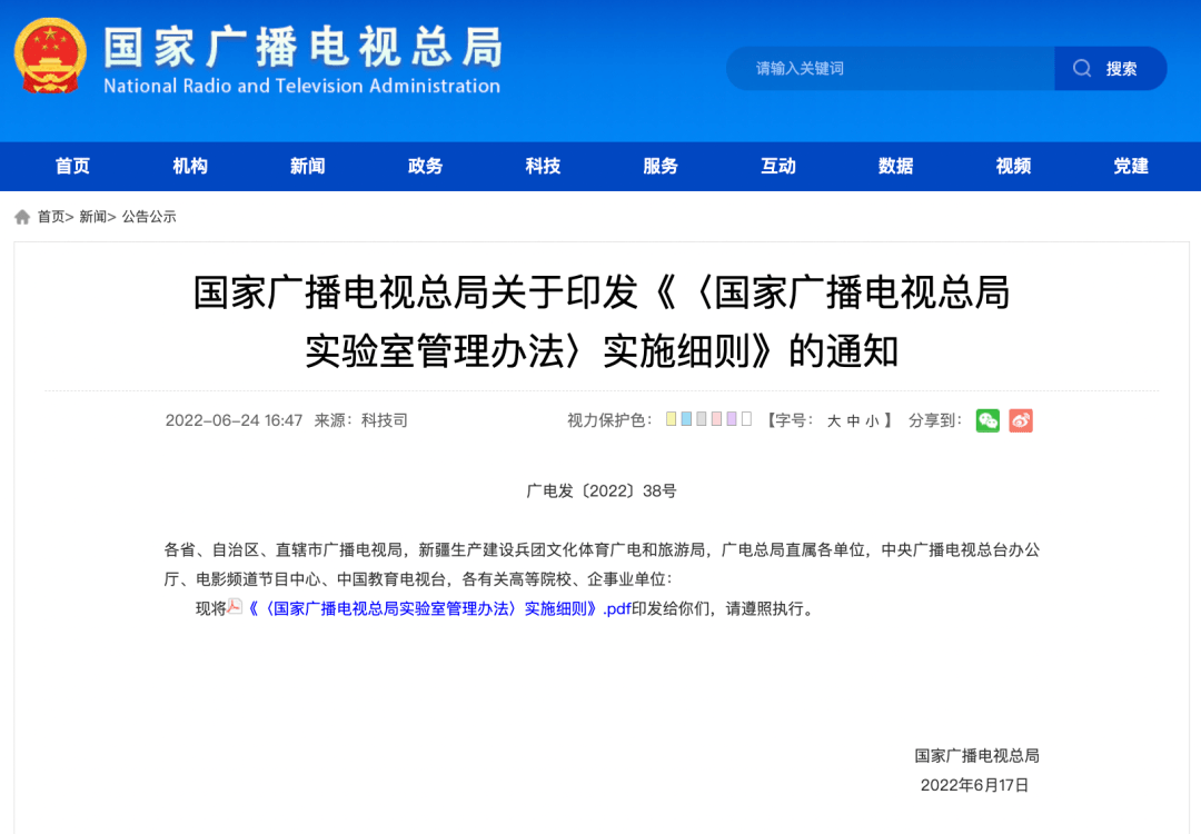 6月24日,国家广播电视总局印发《〈国家广播电视总局实验室管理办法〉实施细则》的通知。