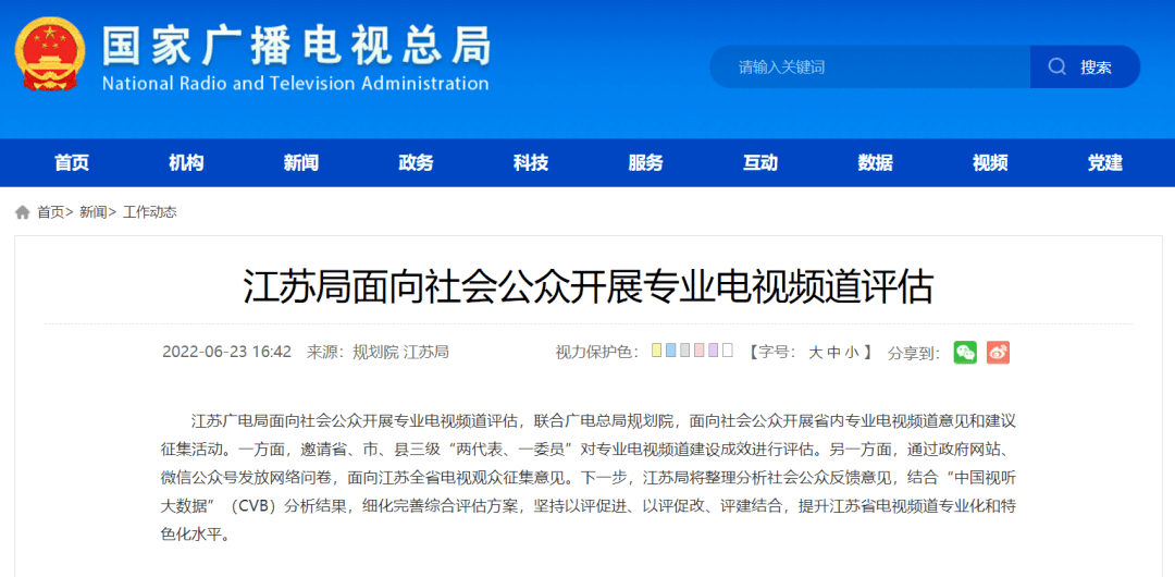 根据总局的指示精神, 6月23日消息,江苏广电局面向社会公众开展专业电视频道评估,联合广电总局规划院,面向社会公众开展省内专业电视频道意见和建议征集活动——