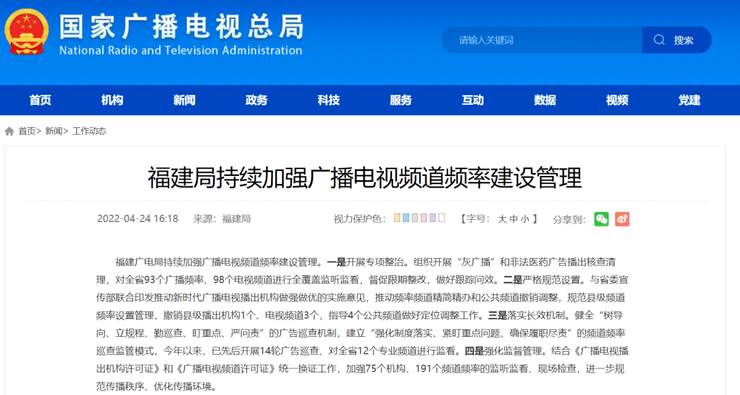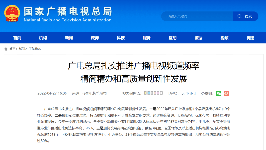 4月27日消息,广电总局通报广播电视频道频率精简精办和高质量创新性发展工作推进情况——