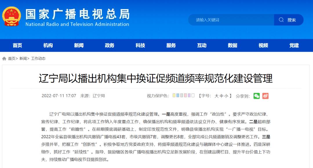 7月11日消息,辽宁广电局以播出机构集中换证促频道频率规范化建设管理——