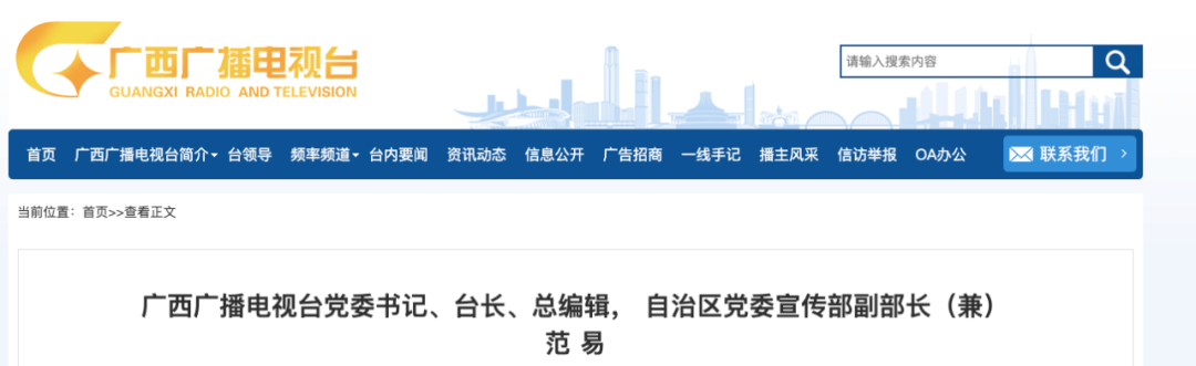 日前,广西广播电视台官方网站发布公告称,范易任广西广播电视台党委书记、台长、总编辑,自治区党委宣传部副部长(兼)。