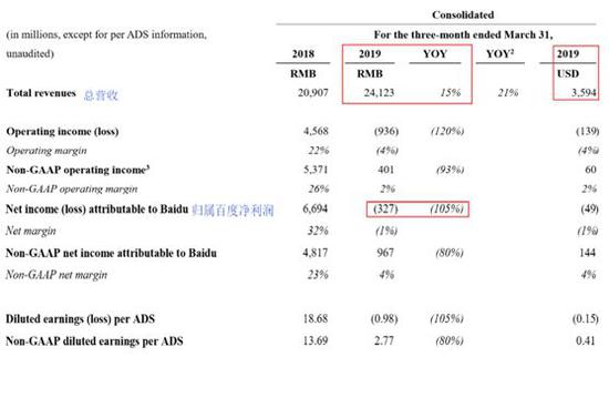 昨天上午,百度公布了2019年一季度未经审计的财务报告。一季度,百度营收241亿元(约合35.9亿美元),低于市场预期242.7亿元;净亏损3.27亿元(约合4900万美元),这是百度2005年上市以来首次出现季度亏损。