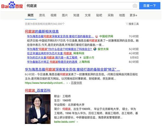 雪上加霜的是,昨日百度搜索还出现了一起错误事件,涉及华为海思总裁何庭波的照片。